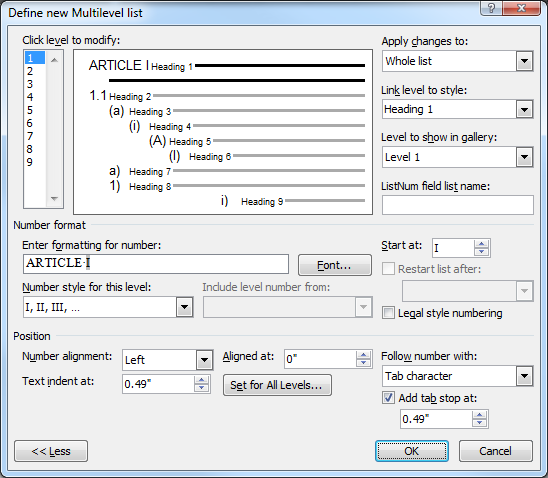 Let’s say you replaced “8” with “Federal Cases.” Now, using the Mark Citation dialog, you’ll see “Federal Cases” in the 8th position of the dropdown, and your field codes for federal cases will indicate “\c 8″. When you generate your TOA, Word will include the heading “Federal Cases” for this category.